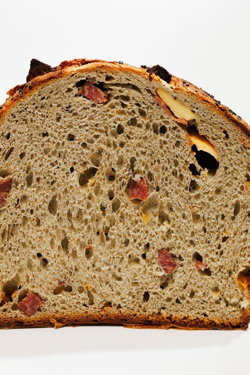 Colomba gastronomica salata dal gusto deciso: salame artigianale, caciocavallo e pasta di sesamo nero per un abbinamento gourmet perfetto per aperitivi e buffet.
