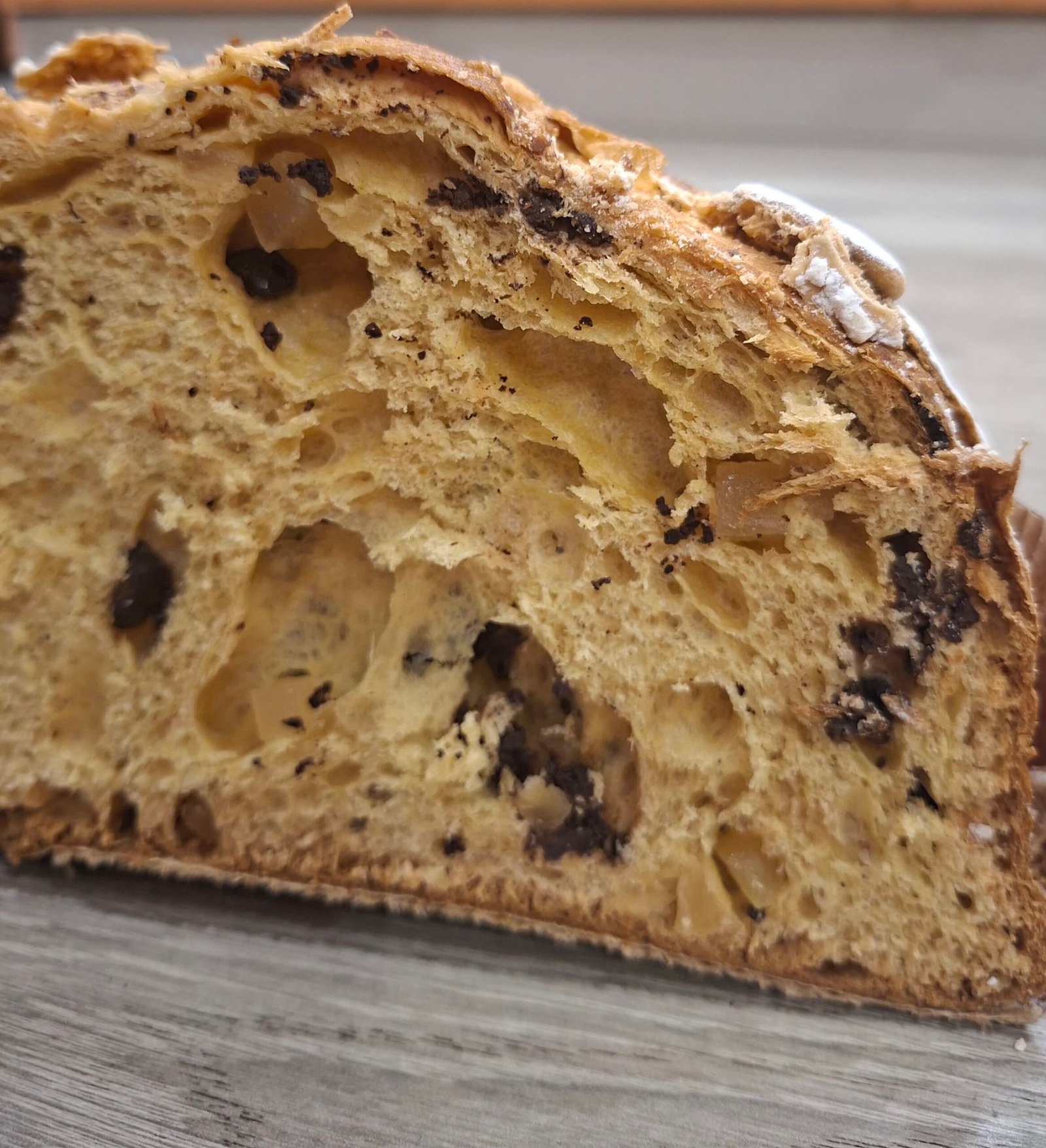 Colomba cioccolato e pera: Ingredienti Farina di GRANO tenero, Burro [PANNA pastorizzata (di LATTE vaccino) (98,00 %), FERMENTI LATTICI], Tuorlo d’UOVO, Lievito naturale di GRANO tenero (contiene FRUMENTO), cioccolato fondente di copertura (64% cacao min) [Fave di cacao della Repubblica Domenicana, Zucchero, Burro di cacao, Emulsionante [Lecitina di SOIA], Estratto naturale di vaniglia,LATTE],], pera dell’Emilia Romagna (Pera dell’ Emilia Romagna I.G.P., Sciroppo di glucosio-fruttosio, Zucchero,), Zucchero, Acqua Sale iodato, arancia in pasta, vaniglia in pasta