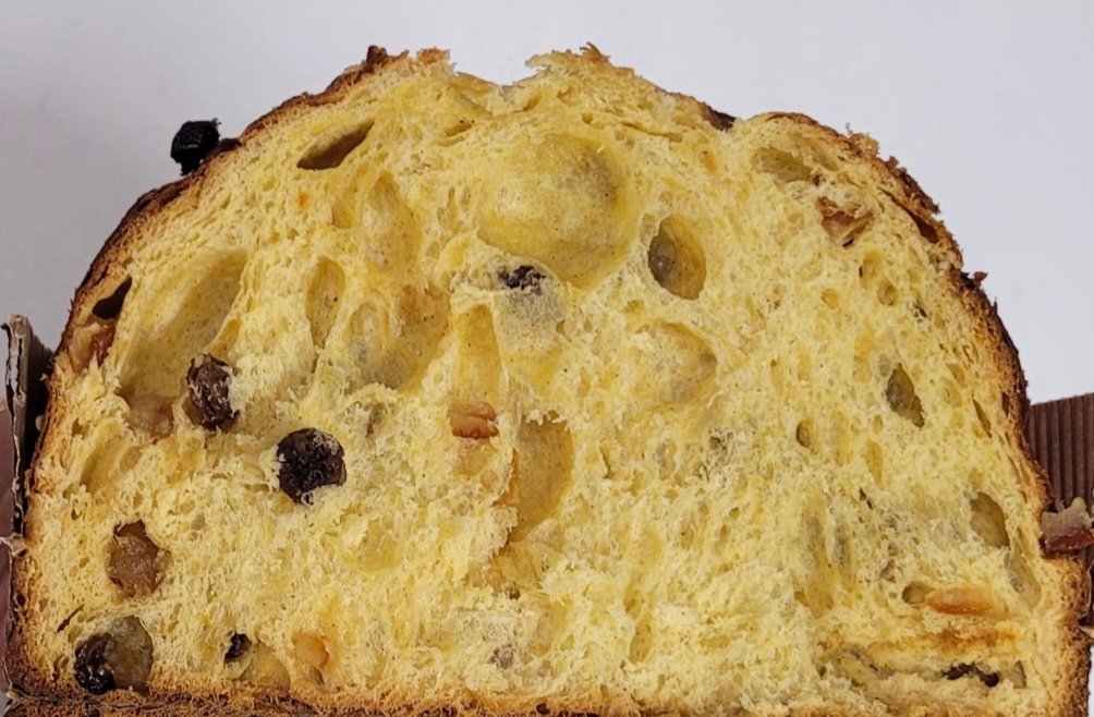 Farina di GRANO tenero, Burro [PANNA pastorizzata (di LATTE vaccino) (98,00 %), FERMENTI LATTICI], Tuorlo d’UOVO, Lievito naturale di GRANO tenero (contiene FRUMENTO), Zucchero, Uvetta [Uva sultanina, Olio di girasole], Arancia candita [Scorza di arancio, Sciroppo di glucosio-fruttosio, Zucchero], Acqua, Sale iodato, arancia in pasta, vaniglia in pasta.